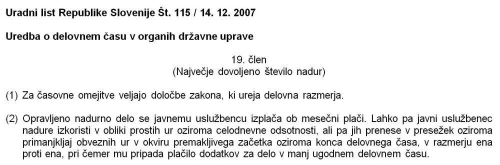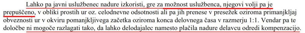 Nadure pa se lahko koristijo kot proste ure le po sklenjenem pisnem sporazumu nadrejenega in pripadnika SV o prenosu viškov ur preko polnega delovnega časa iz preteklega referenčnega obdobja v ure za koriščenje po razmerju 1:1, ob tem pa se izplača dodatek za delo preko polnega delovnega časa v višini 30% urne postavke osnovne plače po 46. členu Kolektivne pogodbe za javni sektor. Iz Uredbe o delovnem času v organih državne uprave, ki v 19. členu določa: