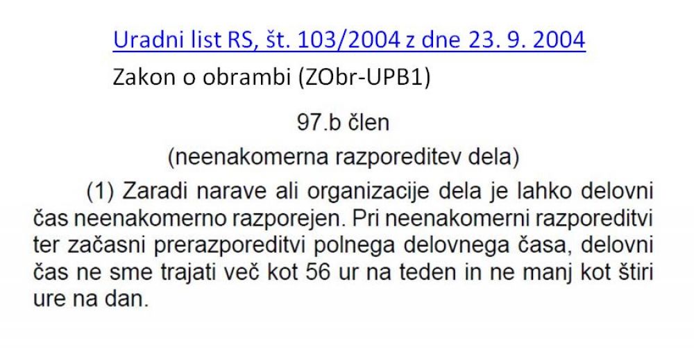 Zakon o obrambi je v 1. odstavku 97.b člena popolnoma jasen. V neenakomerni razporeditvi dela delovni čas ne sme trajati več kot 56 ur na teden in ne manj kot štiri ure na dan. Med pripadniki Slovenske vojske narašča napetost zaradi ukaza Generalštaba o katerem smo že poročali, da je po mnenju in prepričanju SVS nezakonit in bomo zoper njega ustrezno ukrepali, saj ga po zadnjem sestanku s SVS v ponedeljek glede na njegov izid Generalštab nima namena preklicati. V SVS-ju dobivamo vedno več klicev o verbalnih grožnjah, ki so jih deležni vojaki po izraženem nasprotovanju temu, da morajo koristiti viške ur s celodnevno odsotnostjo. Odrejanje koriščenja ur, ki so bile narejene pred 1.1.2015 je nezakonito, ker gre za odrejanje koriščenja ur, ki so po izteku (zaključek po ZDR 31.12.2014) referenčnega obdobja postale nadure.