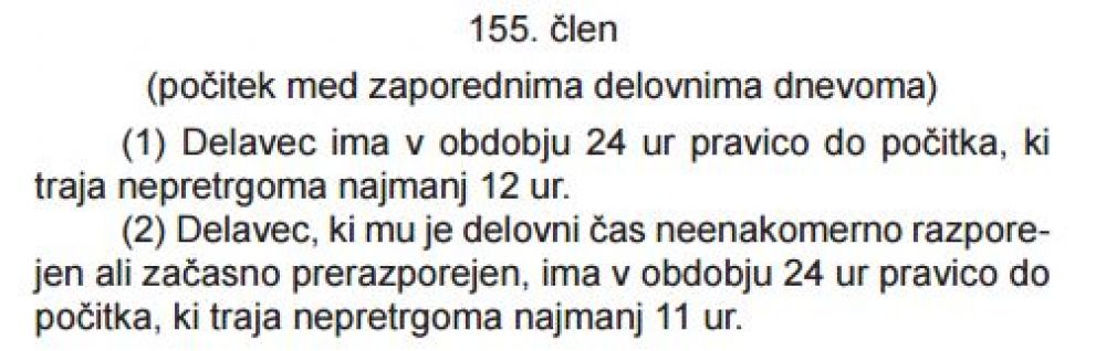 - odredba ministra na podlagi 3. odstavka 97. člena ZObr dopušča odrejanje dela več kot 12 ur dnevno, a ob tem je potrebno v celoti upoštevati 2. odstavek 155. člena ZDR-1, ki določa, da je potrebno v primeru začasne prerazporeditve delovnega časa delavcu zagotoviti najmanj 11 ur nepretrganega počitka, izsek ZDR-1 o tem je na sliki spodaj;