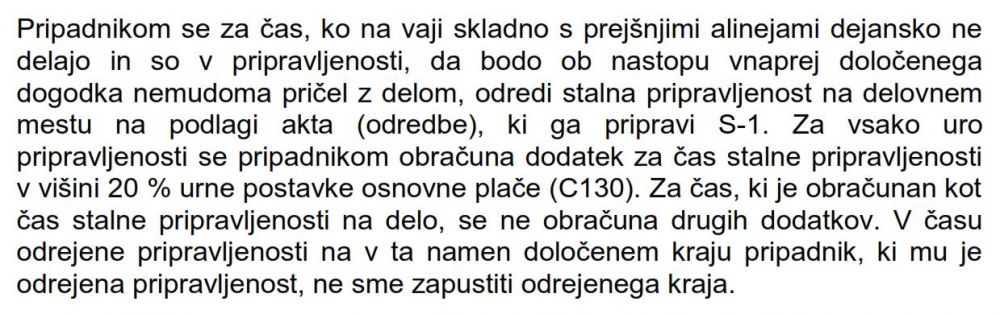 - v vsakem primeru pa poskrbite, da bo vaša dejanska prisotnost na območju izvajanja vojaških aktivnosti evidentirana na mesečni urni kartici - ARDČ, pa tudi če za čas prisotnosti na določenem kraju ali določenem mestu ne prejmete nobenega plačila, saj bo SVS pozval vse pripadnike k tožbam za plačilo delovnega časa v skladu s splošnimi predpisi, kot je že uvodoma pojasnjeno (nadure za vsako uro na voljo delodajalcu na določenem kraju ali mestu) in za takšne ure delovnega časa v SVS za člane že vlagamo prve tožbe, verjetno bo po pozivu SVS in množičnem vlaganju tožb prišlo na sodišču do vzorčnega postopka, kot v primeru dodatka 30% za delo preko polnega delovnega časa za kompenzirane ure, k ismo ga na prvi stopnji že dobili.