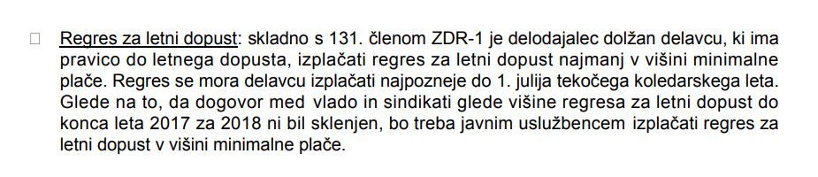 Zaradi mnogih vprašanj pripadnikov SV objavljamo informacije o regresu za leto 2018. Z letom 2018 se za vse zaposlene, tudi tiste z višjimi plačami, uveljavi regres za letni dopust v višini zakonskega minimuma. Regres za leto 2018 bo vsem zaposlenim na Ministrstvu za obrambo izplačan najverjetneje s plačo za mesec maj na dan 5. junij (MORS še ne mopre potrditi dneva izplačila) v višini 842,79 EUR bruto oz. za tiste z minimalno plačo ali pod njo 638 EUR neto, za tiste z višjo plačo, pa je neto odvisen od višine plače (različna akontacija davka) in olajšav. O točnem dnevu izplačila vas bomo obveščali. Na sliki spodaj objavljamo izsek obrazložitve Ministrstva za javno upravo o regresu za leto 2018.