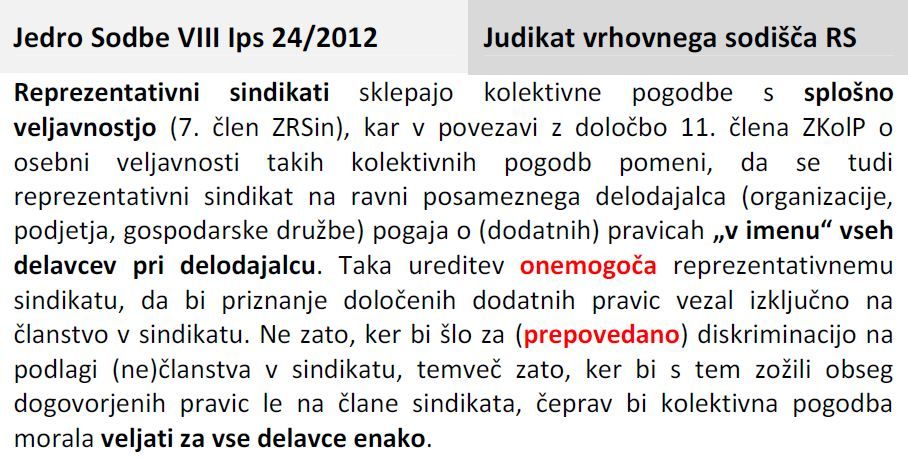 Sindikat vojakov Slovenije pa bo vzporedno zahteval razveljavitev spornih določil Aneksa h Kolektivni pogodbi za negospodarske dejavnosti, saj se je v podobnih primerih diskriminatorne obravnave na osnovi članstva v sindikatu že izoblikovana sodna praksa, ki tega ne dopušča in Vrhovno sodišče RS je v zvezi s tem že zavzelo jasno stališče, da je takšna diskriminacija na osnovi članstva v sindikatu nezakonita. V SVS pa menimo, da je takšna obravnava tudi protiustavna zaradi neenake obravnave, saj smo pred zakoni v Republiki Sloveniji vsi enaki (14. člen Ustave RS), upravičenost do solidarnsotne pomoči pa določa zakon (ZUJF). Komisiji za preprečevanje korupcije je Sindikat vojakov Slovenije že podal prijavo, da preveri ali v spornem aneksu in z njim povezano zavrnitveno odločbo vojaku obstajajo elementi korupcije. Na sliki spodaj je izsek judikata oz. njegovo jedro, v povezavi spodaj pa objavljamo celoten Judikat vrhovnega sodišča Republike Slovenije, ki je odločil o opisani diskriminatorni obravnavi na osnovi članstva v sindikatu.