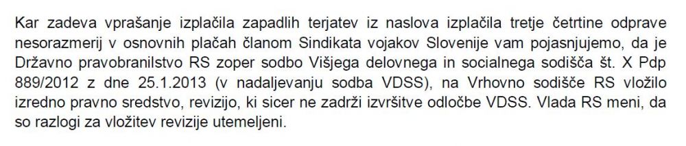 Neuradno smo izvedeli, da bi utemeljen razlog vlade za revizijo naj predstavljalo dejstvo, da imajo nekateri člani Sindikata državnih organov plačo 10. ali še kasneje v mesecu in da je za njih 9. novembra 2010 uveljavljen aneks št. 4 h Kolektivni pogodbi za javni sektor zakonito zamaknil izplačevanje tretje četrtine nesorazmerij, s čimer se v SVS popolnoma strinjamo, tako da se lahko zgodi, da bo vlada v reviziji zoper sodba za Sindikat državnih organov uspešna. Po našem mnenju pa ne more biti uspešna v pritožbi ali nadaljnji reviziji zoper novo sodbo za člane SVS, ker imamo vsi pripadniki Slovenske vojske plačo petega v mesecu in je 9. novembra 2010 uveljavljen aneks protiustavno posegel v že pridobljene pravice pripadnikov Slovenske vojske, saj bi ti morali prejeti s 1. oktobrom 2010 odpravljeno tretjo četrtino nesorazmerja pri plači 5. oktobra. Ob izplačilu plače 5. oktobra je postala ta tretja četrtina del osnovne plače vsakega posameznega pripadnika Slovenske vojske, neizplačevanje pa je nedopusten poseg v že pridobljene pravice pripadnikov Slovenske vojske, kot izhaja iz obrazložitve sodbe.
