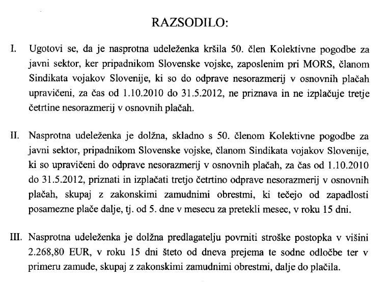 Država je dolžna članom Sindikata vojakov Slovenije priznati in izplačati tretjo četrtino odprave nesorazmerij z obrestmi v roku 15 dni, glasi izrek sodbe, ki nam jo je posredoval odvetnik SVS Peter Kos. Sodba za SVS je prva dobljena tožba na prvi stopnji zaradi neizplačevanja nesorazmerij. Sindikat državnih organov je na drugi stopnji v isti zadevi že dobil tožbo zaradi enakih kršitev Kolektivne pogodbe za javni sektor in na osnovi njene pravnomočnosti je SVS že zahteval njeno izvršitev za svoje člane v mesecu maju. Vlada pravnomočne sodbe ne želi izvršiti in se s tem se po našem mnenju postavlja nad sodno vejo oblasti.