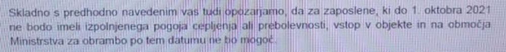 Ne oziraje se na evropske predpise in standarde je Odlok vlade bil sprejet in včeraj je Ministrstvo za obrambo z dopisom že opozorilo vse zaposlene, da bo vstop v objekte in na območja Ministrstva za obrambo 1. oktobra in dalje prepovedan vsem, ki ne bodo imeli izpolnjenega pogoja cepljenja ali prebolevnosti - PC.