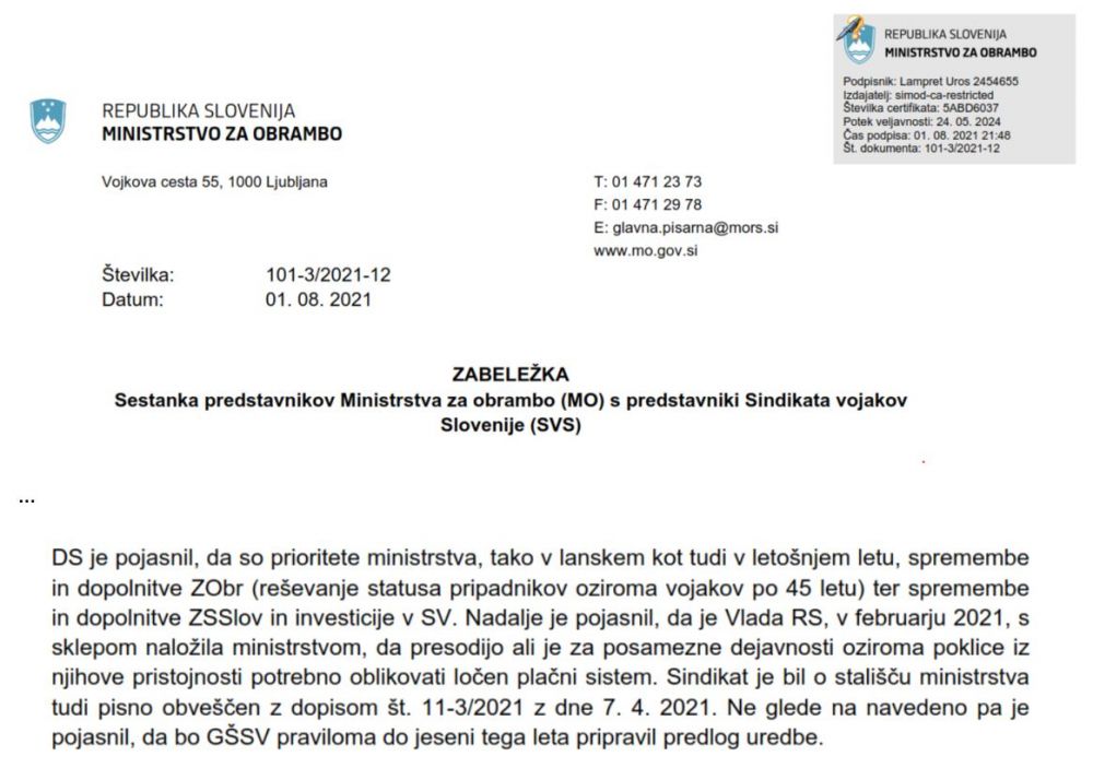 Na sestanku z vodstvom MORS dne 12.07.2021 je SVS prejel zagotovilo, izsek zapisnika o Uredbi je na sliki spodaj, da se bo do jeseni 2021 Uredba popravila in se bo dokončno odpravilo nelogično in nepravično razvrščanje formacijskih dolžnosti v plačne razrede.